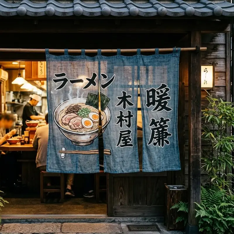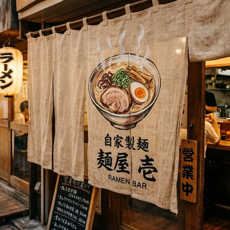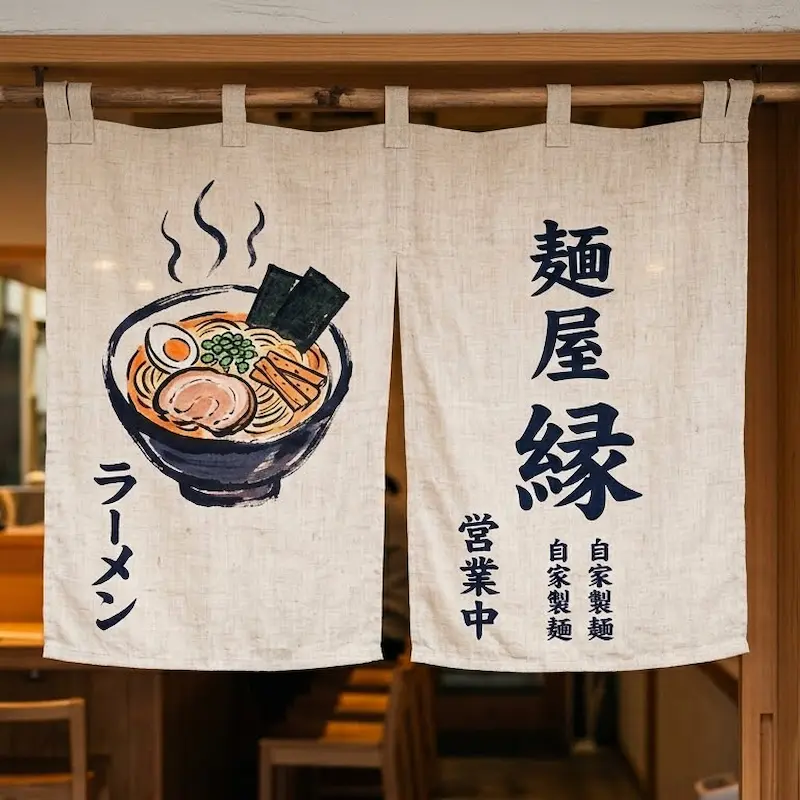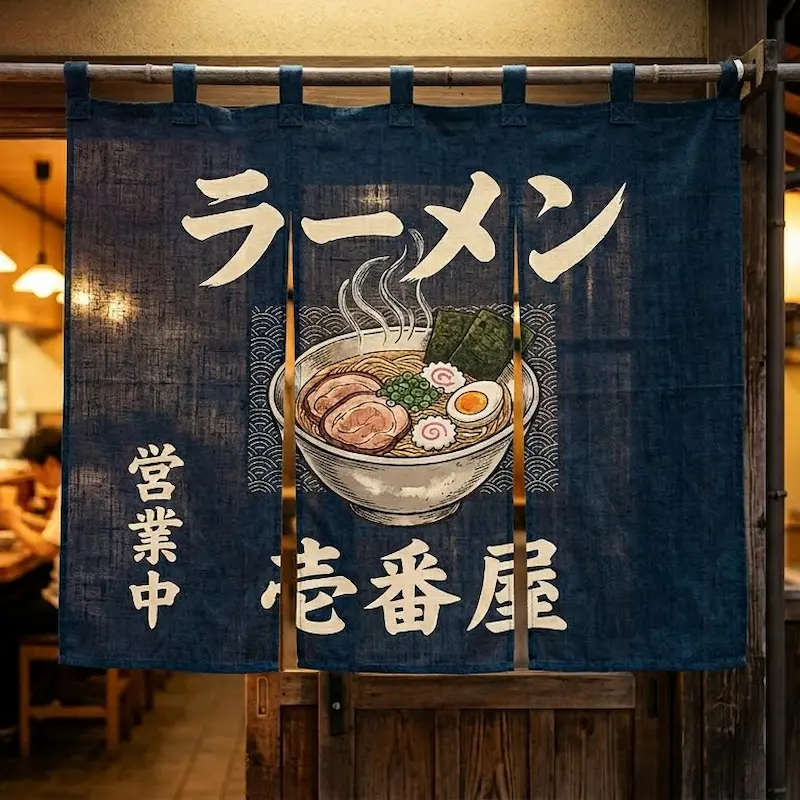 Rèm Noren Ramen là loại rèm treo cửa truyền thống thường xuất hiện trước cửa các quán ramen tại Nhật Bản. Hình ảnh bát ramen và chữ Nhật giúp tạo điểm nhấn đặc trưng cho không gian nhà hàng.